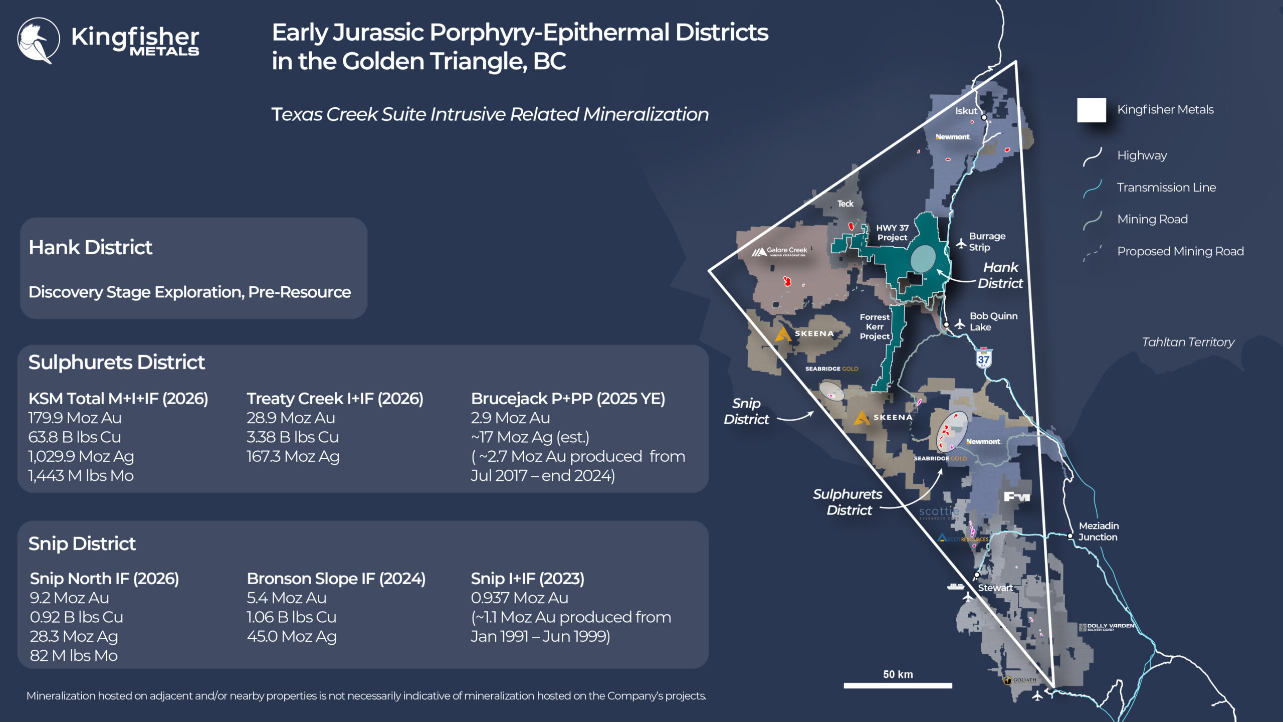 Kingfisher Metals Corp. (https://kingfishermetals.com/) is a Canadian based exploration company focused on copper-gold exploration in the Golden Triangle, British Columbia. Through outright purchases and option earn in agreements (Orogen Royalties, Golden Ridge Resources, and Aben Gold) the Company has quickly consolidated one of the largest land positions in the Golden Triangle region with the 933 km2 HWY 37 Project and 202 km2 Forrest Kerr Project. Kingfisher also owns (100%) two district-scale orogenic gold projects in British Columbia that total 641 km2. The Company currently has 136,727,344 shares outstanding.